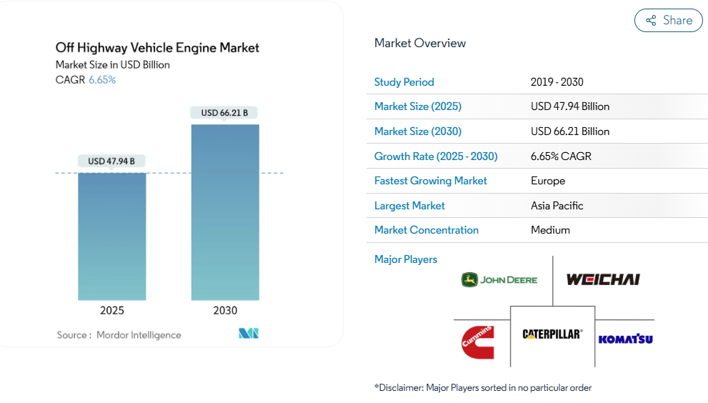 オフハイウェイ車両用エンジン市場は、適度な集中化が見られます。キャタピラー、カミンズ、ディアは、独自のサービスソフトウェアと幅広い販売網によって保護され、最大の設置ベースを誇っています。カミンズは、ディーゼル、天然ガス、水素のバリエーションを共通のバックボーンでホストする HELM™ プラットフォームを立ち上げ、燃料間の顧客の切り替えコストを削減しました。