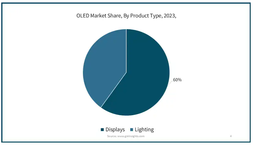 製品タイプ別では、OLED 市場はディスプレイと照明に分けられます。照明セグメントは、2024年から2032年の間に15.2%のCAGRで成長すると予想される、最も急成長しているセグメントです。