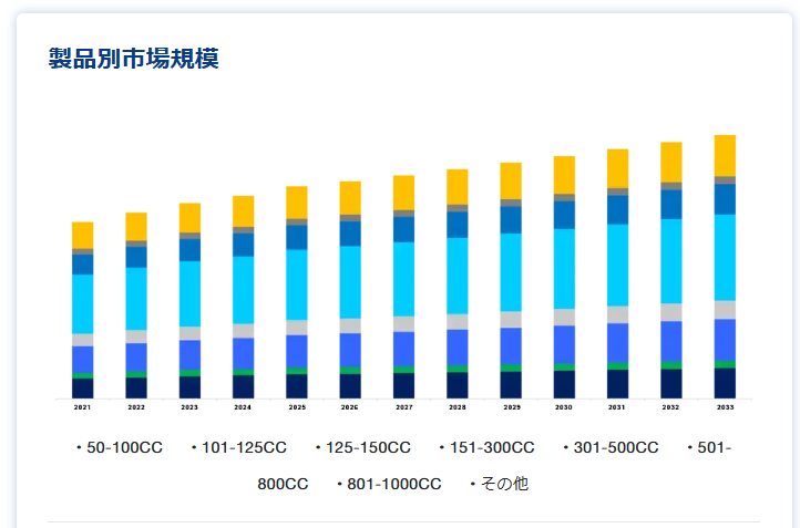 この市場は、製品、用途、地域、競合他社に基づいてセグメント化することができる。 製品別では、50-100CC、101-125CC、125-150CC、151-300CC、301-500CC、501-800CC、801-1000CC、その他のセグメントに分けられる。 スポーツバイクはパワフルなエンジンを搭載しており、他のオートバイに比べて軽量であるため、1000CCセグメントが予測期間中に最も高い市場成長を遂げると予想される。 高性能を求める傾向の高まり、オフロード走行や特定のスポーツの増加により、現代の市場で最も高い製品タイプとなっている。