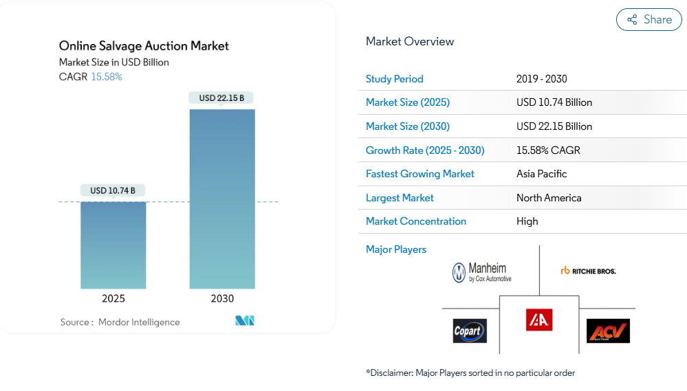 新規参入企業はディーラー向け卸売セグメントに注力しており、ACV Auctions社は事故歴のない車両の評価、モバイル検査、即日資金調達を提供することで、2024年にマーケットプレイスのGMVを25億米ドルまで引き上げましたが、シェアは依然として低い水準です。ベンチャー資本によるニッチプレイヤーは、クラシックカーやEVバッテリーなどの特殊在庫をターゲットとし、大規模なヤード所有を伴わない軽量デジタルプラットフォームを活用しています。しかしながら、規制順守、資本集約的な保管要件、信頼できる売り手との関係構築は依然として参入障壁が高く、オンライン廃車オークション市場における既存事業者を保護しています。