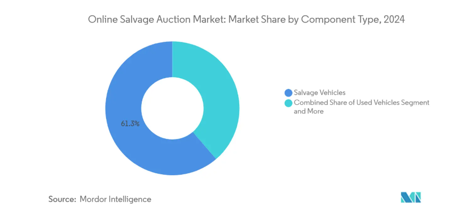 2024年の収益の61.32%を事故車が生み出し、オンライン事故車オークション市場における日々のオークションペースを維持する在庫の基幹として確固たる地位を築きました。しかしながら、所有権処理、検査、物流などの管理サービスは、15.78%のCAGRでユニット成長を上回るペースで拡大しており、プラットフォームを周期的なボリューム変動から保護する手数料多様化への転換を支えています。タイトルエクスプレスは2024年に約100万件の書類を処理し、コンプライアンス業務の外部委託がコストセンターを収益源へ転換する実例を示しました。ACVのクリアカーのようなAI駆動型検査システムは正確な状態評価を提供し、買い手の信頼を醸成。これにより落札価格が上昇し、車両あたりの手数料が増加します。