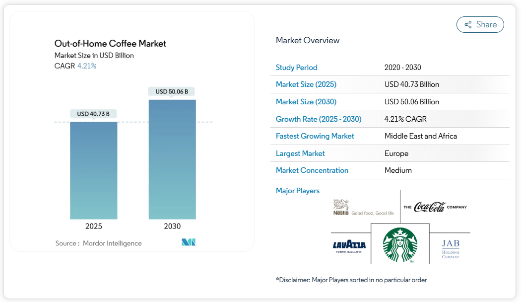 外食コーヒー市場は、市場集中度が中程度(スコア6)であり、分散した競争環境を示しています。この市場は、グローバルなコーヒーチェーン店、地域専門業者、技術主導の新規参入企業、地元事業者など、多様なプレイヤーの存在が特徴です。家庭外での便利で高品質なコーヒー体験に対する消費者需要の高まりが競争を激化させ、市場参加者は進化する消費者の嗜好に適応し、革新を迫られています。こうした多様なプレイヤーの相互作用が、市場の軌道を形作り続けるダイナミックで競争的な環境を生み出しています。