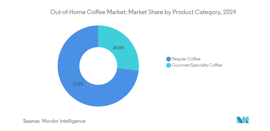一方、中東・アフリカ地域は、2025年から2030年にかけて年平均成長率(CAGR)5.31%と予測される、外食コーヒー市場で最も急速に成長している地域です。このダイナミックな成長は、都市人口の増加、ライフスタイル嗜好の変化、可処分所得の向上により、おしゃれで高品質なコーヒー体験への需要が高まっていることが原動力となっています。コーヒー小売インフラへの投資と国際的なコーヒーチェーン店の進出により、これらの地域におけるアクセスと認知度が大幅に拡大しています。さらに、新たなライフスタイルトレンドに対する文化的受容性と若年層人口が、家庭外でのコーヒー消費への移行を支えています。この地域の成長は、より広範な経済多角化戦略と観光業の拡大も反映しており、家庭外コーヒー製品の消費者基盤をさらに拡大しています。