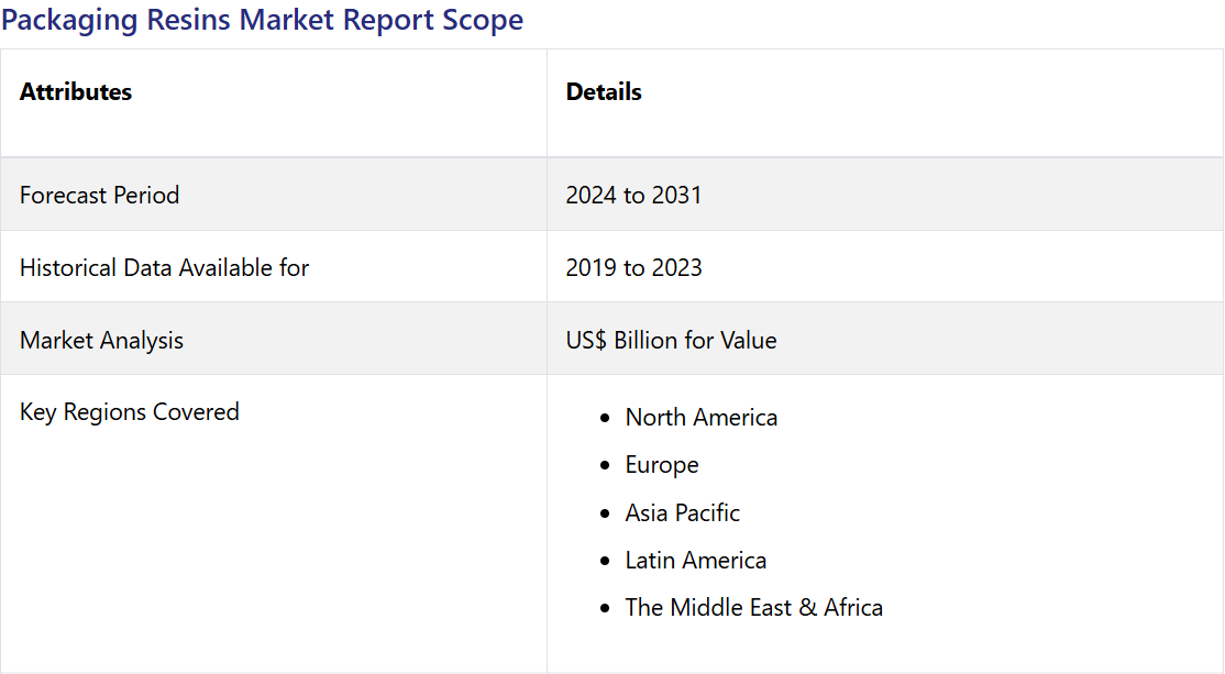Packaging Resins Market by Type (PET, Polypropylene, Polystyrene, PVC, Others), Application (Food & Beverages, Consumer Goods, Healthcare, Others), and Region for 2024 to 2031