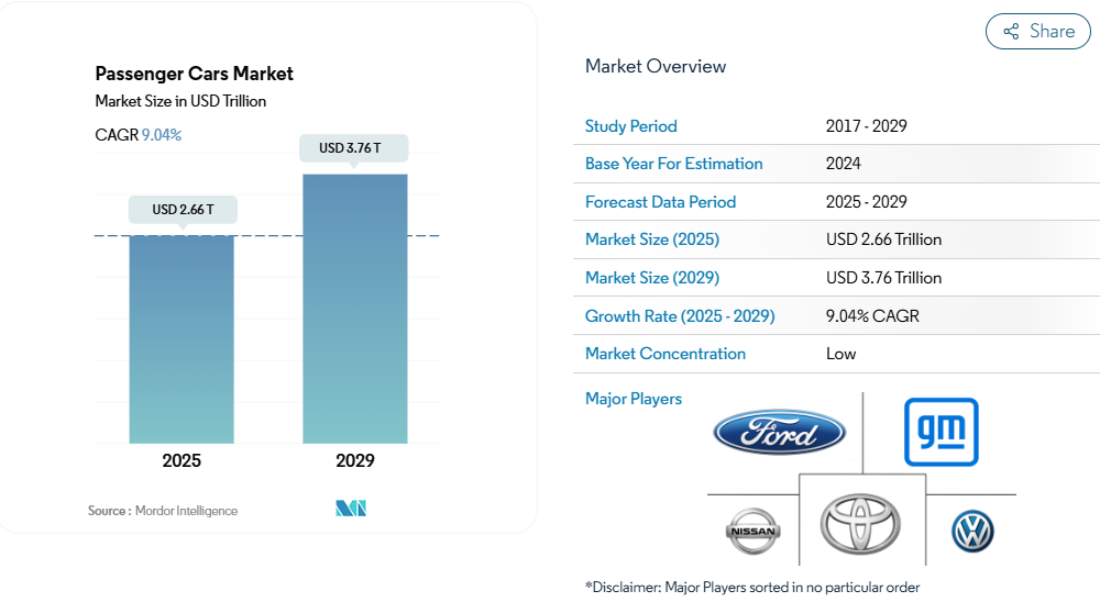 乗用車市場の規模は、2025年に2.66兆米ドルと推定されており、2029年までに3.76兆米ドルに達すると予測されています。予測期間(2025-2029年)における年平均成長率(CAGR)は9.04%と見込まれています。