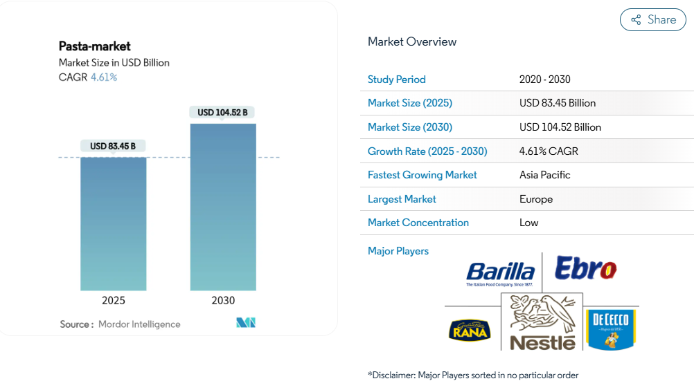 パスタ市場の規模は2025年に834億5000万米ドルに達し、2030年までに1045億2000万米ドルへ成長し、年平均成長率(CAGR)4.61%を記録すると予測されています。消費者の利便性への要求、健康志向の配合、持続可能な生産が、この成長を後押ししています。パスタの世界的な魅力は、手頃な価格、汎用性、そして多様な食習慣や文化的嗜好への適応性に由来しています。ヨーロッパ市場は、イタリアの堅調な生産・輸出能力に支えられ、市場をリードしております。