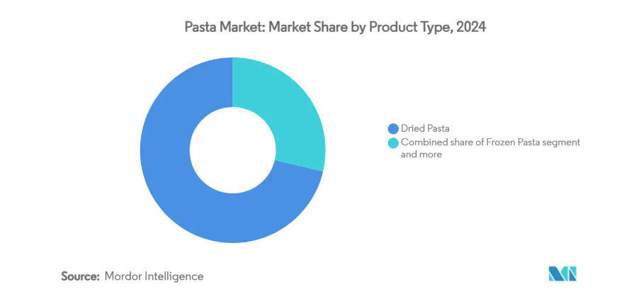 2024年現在、乾燥パスタは手頃な価格、長期保存性、広範な流通網により71.32%という圧倒的な市場シェアを占めています。保存性の高さから、特に価格と利便性を重視する市場において常備食品としての地位を確立しており、こうした特性が乾燥パスタの幅広い支持を支えています。モンテズ・ファインフーズのようなブランドは、ブロンズダイ押出や低温乾燥といった従来型の処置を再導入し、食感の向上と競争の激しい市場での差別化を図ることで、このセグメントの認知度を高めています。