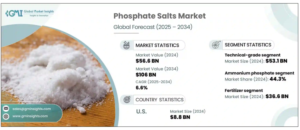 世界のリン酸塩市場は2024年に566億米ドルと評価され、2025年から2034年にかけて年平均成長率6.6%以上で成長すると推定されています。