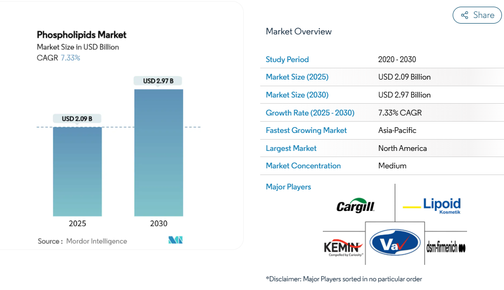 認知機能の重要性に対する認識の高まりと消費者のライフスタイルの変化により、脳の健康をサポートする栄養補助食品の需要が拡大しております。リン脂質は神経機能と構造における役割から必須成分となりつつあります。欧州食品安全機関(EFSA)は1日あたりのコリン摂取量を400mgと推奨しており、これは一般的な食事摂取量を上回る数値であり、リン脂質サプリメント市場における大きな機会を示唆しております。