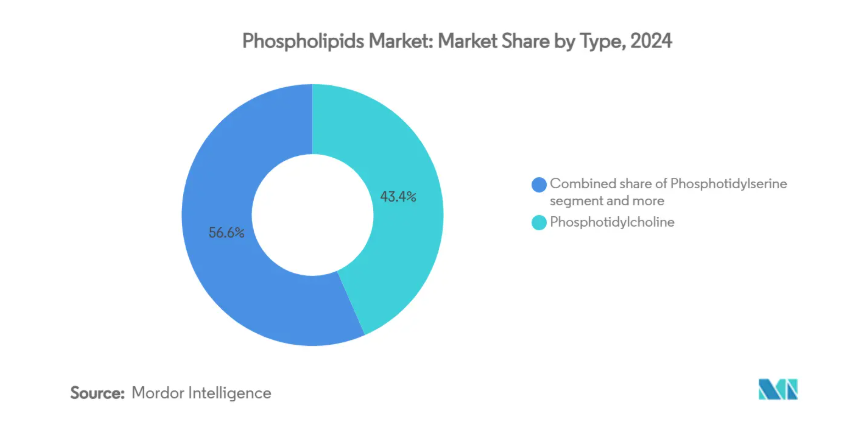 2024年時点でホスホチジルコリンは43.44%の市場シェアを占めており、これは主に認知機能健康補助食品や医薬品製剤への使用によるものです。記憶や学習を支えるアセチルコリン合成のためのコリン源としての機能は、広範な研究を通じて実証されています。複数の地域における規制当局の承認により、このセグメントの市場での地位は強化されており、代替リン脂質の種類が大きな市場シェアを獲得することは困難です。