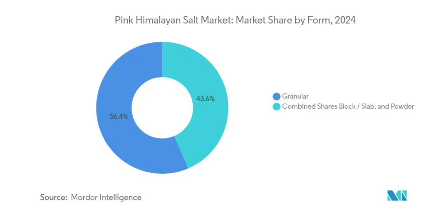 ピンクヒマラヤソルト市場では顆粒状形態が明確に好まれており、2024年現在で市場シェアの56.43%を占めております。この圧倒的な存在感は、食品産業全体における同形態の汎用性と実用的な利点を反映しております。業務用厨房では、正確な調味のための安定した溶解性が評価され、家庭料理では仕上げ塩としての美的魅力が好まれています。プロフェッショナルと家庭用両環境で広く採用されることで、粒状形態は産業標準としての地位を確立しました。