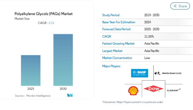 ポリアルキレングリコール(PAGs)市場は予測期間(2025-2030年)に11%を超えるCAGRを記録すると予測されています。