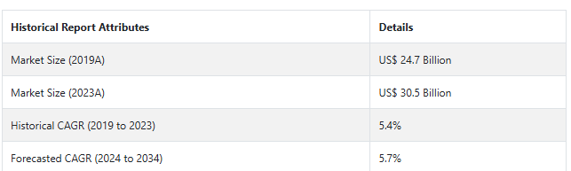 予測期間2024年から2034年の市場について予測分析を実施したところ、2019年から2023年の過去の成長率は5.4%でした。予想される成長(2024年から2034年)の売上高は、CAGRで5.7%上昇し、絶対額で239億米ドルの機会に達する見込みです。