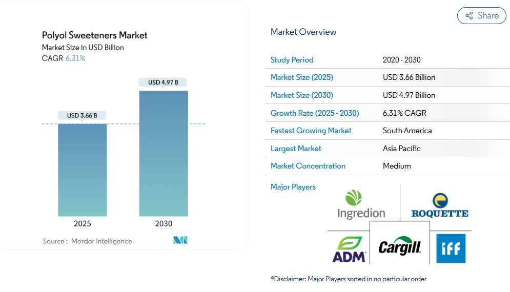 世界のポリオール甘味料市場:エリスリトール、ソルビトール、マルチトール、イソマルト、その他(2025年~2030年)