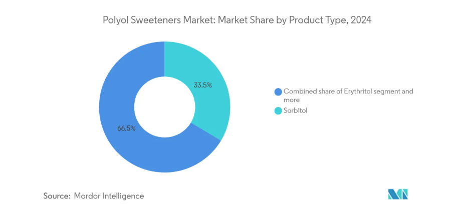 2024年時点で、ポリオール甘味料市場においてソルビトールが33.54%のシェアを占めております。食品、医薬品、工業分野における幅広い用途により、最大の市場シェアを維持しております。食品産業では、ソルビトールは無糖製品における主甘味料および保湿剤として機能し、医薬品分野では錠剤製剤の安定剤・結合剤として利用されています。その市場優位性は、特に無糖菓子、糖尿病向け食品、口腔ケア製品において、甘味料と機能性原料の両面での有効性に起因しています。