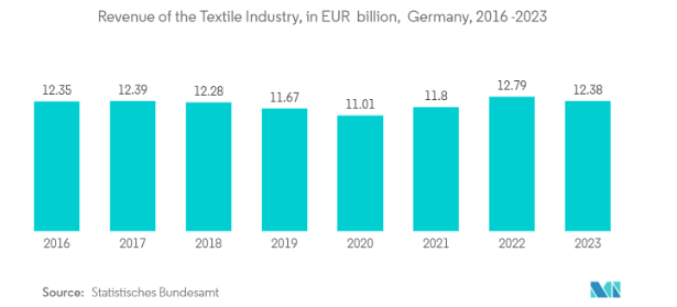 - 同様に、連邦統計局(ドイツの連邦当局)によると、繊維産業の収益は2022年に129.7億ユーロ(139.6億米ドル)、2023年には123.8億ユーロ(133.0億米ドル)に達します。