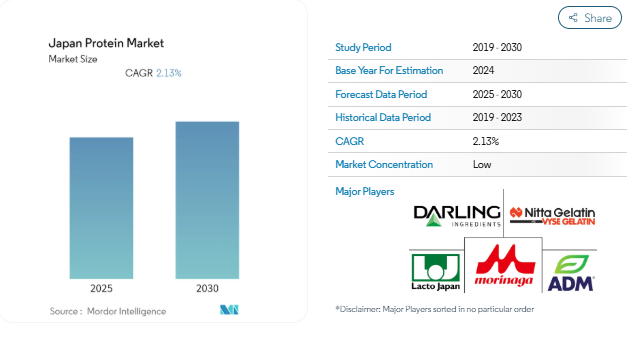 日本プロテイン市場は予測期間(2025-2030年)に年平均成長率2.13%を記録すると予測