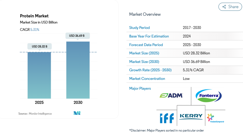 タンパク質市場の規模は、2025年に283億2,000万米ドルと推定されており、2030年までに366億9,000万米ドルに達すると予測されています。予測期間(2025年~2030年)における年平均成長率(CAGR)は5.31%と見込まれています。