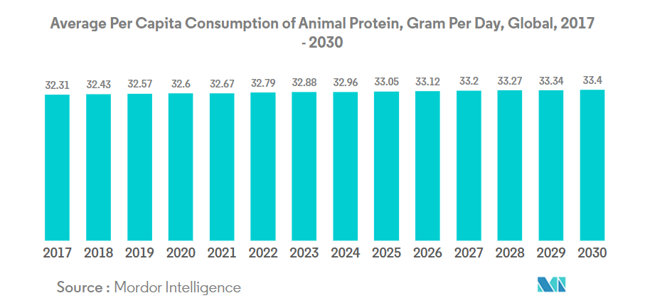 - 世界の動物性タンパク質消費は著しい成長を遂げており、乳製品は重要かつ拡大を続けるセグメントを占めております。特にアスリートの間で高まる乳タンパク質の健康効果への認識が、世界的な一人当たり動物性タンパク質消費を促進しております。例えばインドでは、2022年から2023年にかけて、消費者の37%という相当な割合が1日平均1.5~2リットルの牛乳摂取を報告し、さらに10%が1日3リットル以上を消費しました。これらの数値は特定地域における一人当たり消費量の高さを示し、世界的な動物性タンパク質への需要の大きさを裏付けています。