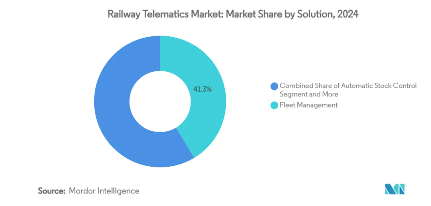 鉄道各社が貨車のリアルタイム位置情報、状態監視、待機時間削減を優先した結果、2024年の収益の41.33%を車両管理ソリューションが占めました。堅牢なダッシュボードは生GPSデータやセンサー信号を指令行動に変換し、サイクルタイムの短縮と燃料消費削減を実現。鉄道テレマティクス市場における中核モジュールとしての地位を確固たるものにしています。リモートデータアクセスは最も成長が速い分野であり、クラウドAPIにより計画担当者が過去データとリアルタイムデータを並行して分析できることから、年平均成長率8.46%で拡大しています。自動在庫管理・追跡プラットフォームは中堅分野に位置し、構造化されたイベントを基幹システムに供給することで、鉄道の流れをサプライチェーン全体のノードと連携させます。
