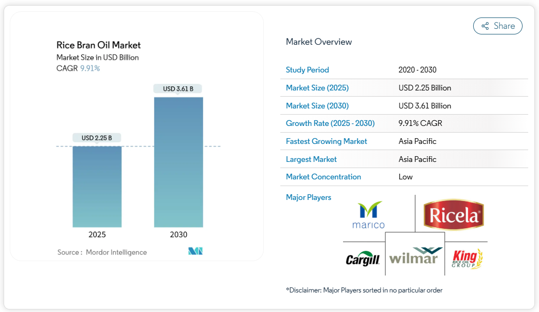 世界の米ぬか油市場は重要な節目を迎え、2025年には22億5,000万米ドルに達しました。産業アナリストは、予測期間中に堅調な年平均成長率(CAGR)9.91%を示し、2030年までに36億1,000万米ドルへと大幅に拡大すると予測しております。この目覚ましい市場変革は、米ぬか油が活用されきれていなかった農業副産物から、需要の高い高級食用油へと成功裏に進化した過程を如実に物語っております。
