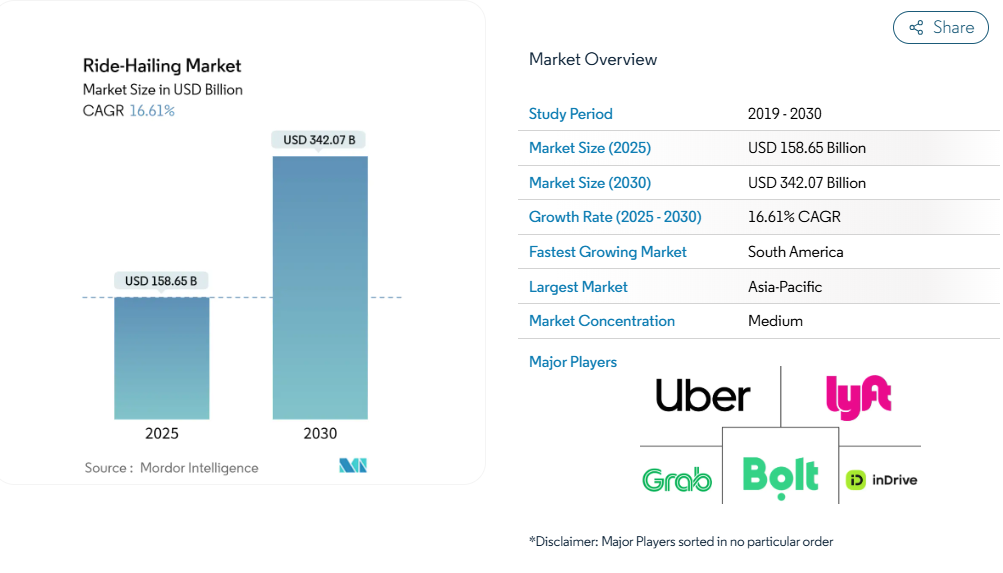 世界の配車サービス市場:二輪車、三輪車、乗用車、その他(2025年~2030年)