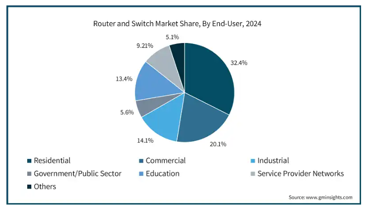 エンドユーザー別に見ると、ルーター・スイッチ市場は家庭用、商業用、産業用、政府/公共機関用、教育機関用、サービスプロバイダネットワーク用、その他に分類されます。