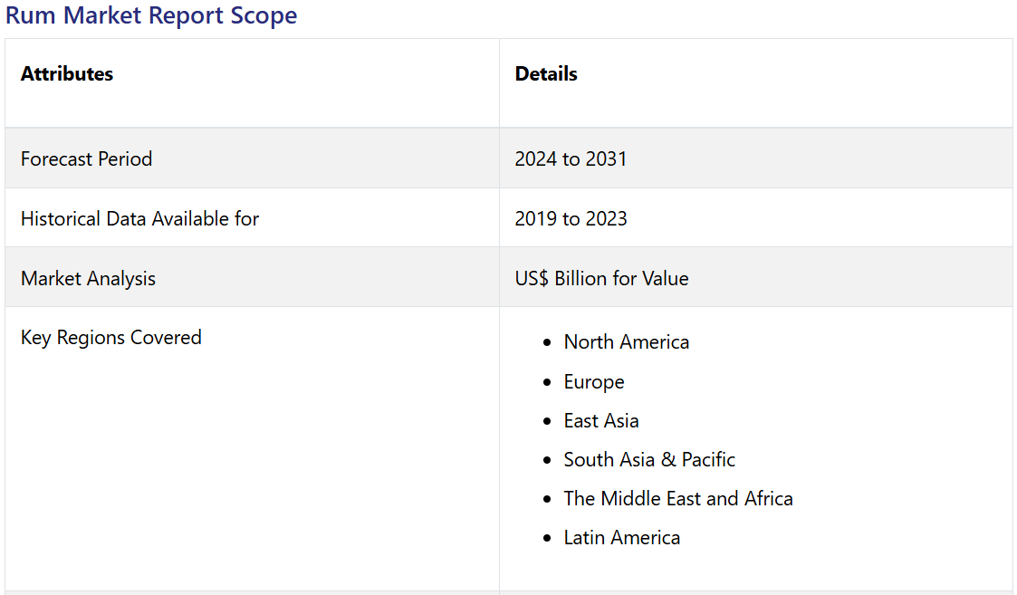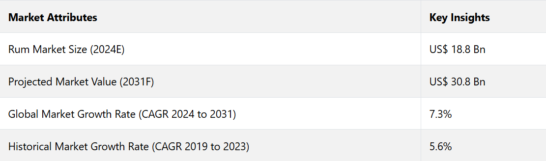 ラム酒の売上は、2024年から2031年の予測期間において、年平均成長率7.3%で推移すると推定されています。