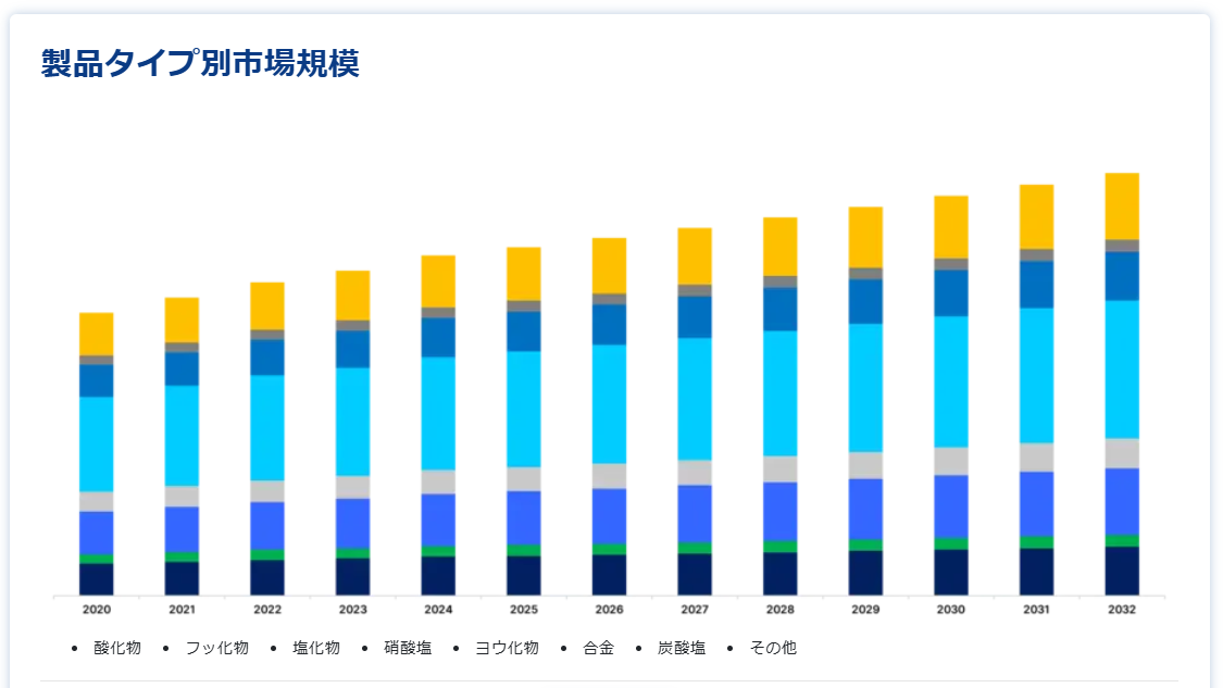 製品タイプに基づき、世界のスカンジウム市場は酸化物、フッ化物、塩化物、硝酸塩、ヨウ化物、合金、炭酸塩、その他に二分される。