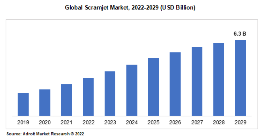 2022年のスクラムジェット市場規模は52億ドル。年平均成長率(CAGR)3%で、予測期間中の市場規模は63億米ドルになると予測されている。