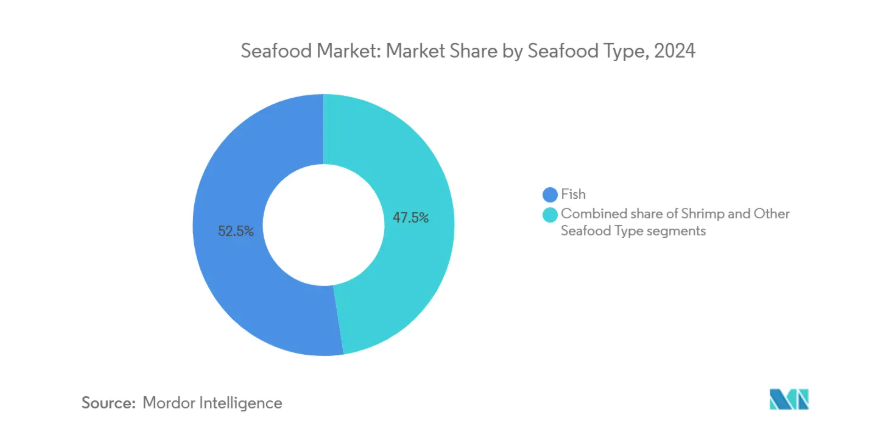 より多くの消費者が健康的な食生活に注力し、タンパク質豊富な食品を食事に取り入れるようになっていることから、世界の水産物需要は増加しています。国際食品情報評議会(IFIC)の2024年食品・健康調査によれば、消費者の71%が積極的にタンパク質摂取量の増加に取り組んでおり、食習慣の大きな変化がうかがえます[1]。2024年5月時点のPubMed Centralのデータによると、水産物は総重量の20~30%がタンパク質で構成されており、赤身肉や鶏肉と比較してより健康的で低脂肪なタンパク源とされています[2]。世界自然保護機関(WWF)は、世界中で30億人以上が野生捕獲および養殖の魚介類を主要な動物性タンパク源として依存していることを強調し、世界の栄養安全保障を確保する上で重要な役割を担っていると指摘しています[3]。これらの要因が魚介類消費の持続的な成長を促進しており、養殖業の拡大、持続可能な漁法、サプライチェーン効率の向上への投資増加を促しています。持続可能性と近代化へのこの高まる注目が、魚介類市場の長期的な発展を支えると期待されています。