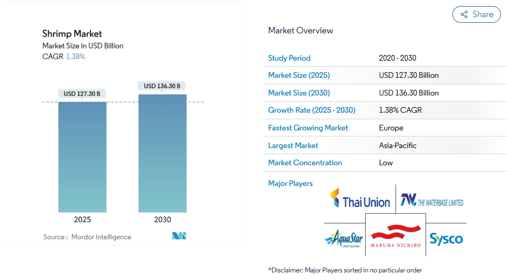 エビ市場は2025年に1,273億米ドルと評価され、2030年までに1,363億米ドルへ成長すると予測されています。これは当該期間における年平均成長率(CAGR)1.38%を反映した数値です。気候変動や疾病発生が従来の開放式養殖の信頼性を脅かす中、陸上循環式養殖システムが注目を集めています。産業統合企業は、原料調達・加工・流通を含むバリューチェーン全体を管理することで業務効率化を図っております。