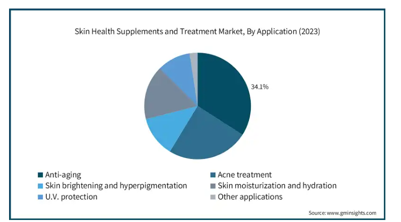 用途別に見ると、皮膚の健康サプリメント・治療市場は、アンチエイジング、ニキビ治療、美白・色素沈着、皮膚の保湿・潤い、U.V.保護、その他の用途に二分されます。アンチエイジング分野は、2023年に34.1%という大きな市場シェアを占めました。