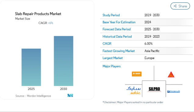 スラブ補修製品市場は予測期間中に6%を超えるCAGRを記録する見込み。