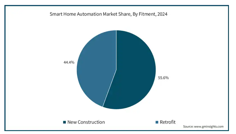 新築市場は、スマートライト、セキュリティシステム、エネルギー制御システムなどのスマートホーム機能の採用増加により、2024年には世界のスマートホームオートメーション市場の55.6%のシェアを占めると予想されます。さらに、再生可能エネルギーハーベスティングのような機能を組み込むことで、新築の持続可能性指数をサポートしています。