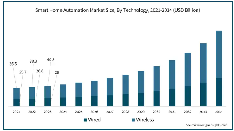 この調査レポートは、スマートホームオートメーション市場を詳細に調査し、2021年から2034年までの収益(百万米ドル)を予測しています: