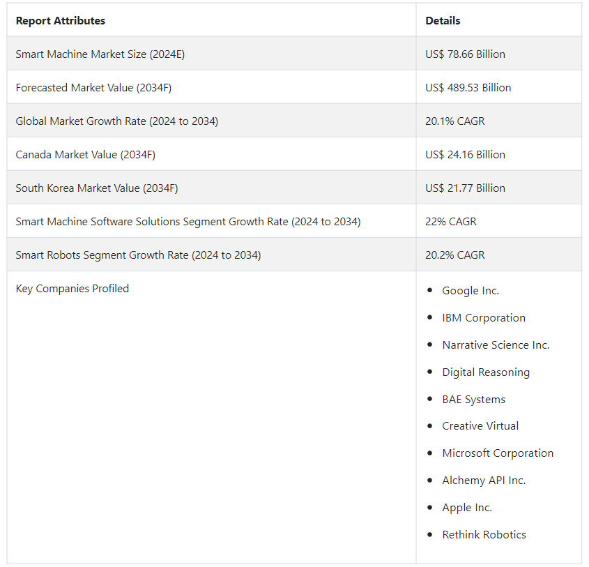 世界のスマートマシン市場は、2024年には786.6億米ドルと推定され、2034年末には4,895.3億米ドルに達すると予測されている。 スマートマシンの世界的な需要は、2024年から2034年までCAGR(年平均成長率)20.1%という著しく高い伸び率で増加すると予測されている。