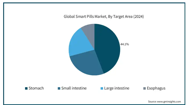 対象領域に基づいて、スマートピル市場は胃、小腸、大腸、食道に区分されます。胃セグメントは2024年の市場シェア44.1%で市場を支配。