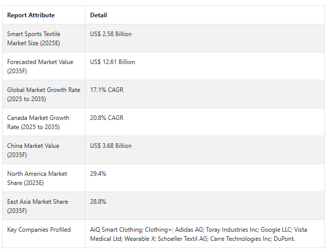 世界のスマートスポーツテキスタイル市場の売上高は、2025年には25.8億米ドルに達すると予測され、さらに注目すべきCAGR 17.1%で上昇し、2035年には126.1億米ドルに達すると予測されています。