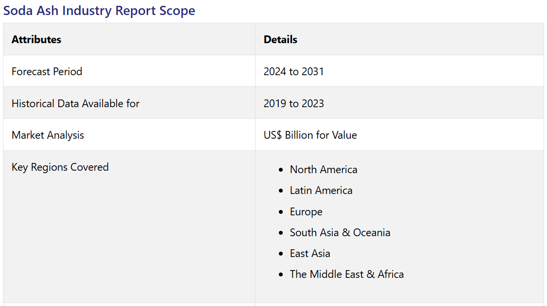 Soda Ash Market by Grade Type (Light Grade, Dense Grade), Type (Synthetic, Natural), End Use (Glass, Soaps & Detergents, Chemicals, Water Treatment), and Region for 2024 to 2031