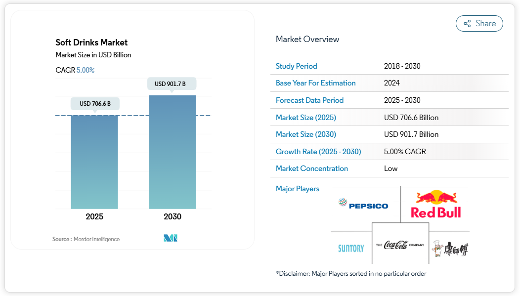ソフトドリンク市場の規模は、2025年に7,066億米ドルと推定され、2030年までに9,017億米ドルに達すると予測されています。予測期間(2025-2030年)における年平均成長率(CAGR)は5.00%と見込まれています。