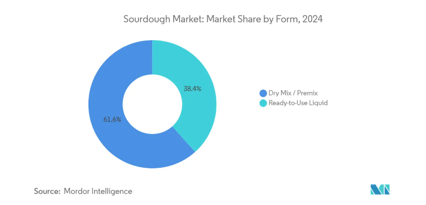 ライ麦ベースのスターターは、食物繊維含有量の高い健康志向のパンへの消費者関心の高まりを背景に、2030年までに年平均成長率(CAGR)7.36%で成長すると予測されています。地域密着型ベーカリーによる従来型のダークライ麦パンの復活も、この成長に寄与しています。ライ麦ベースのスターターは独特の豊かな風味と密度の高い食感を特徴とし、健康志向の消費者や、職人的で伝統的なスタイルのパンを好む層に支持されています。ライ麦製品への需要拡大は、より栄養価が高く本格的なパンへの嗜好変化、ならびに従来型の製法への再評価を反映しています。