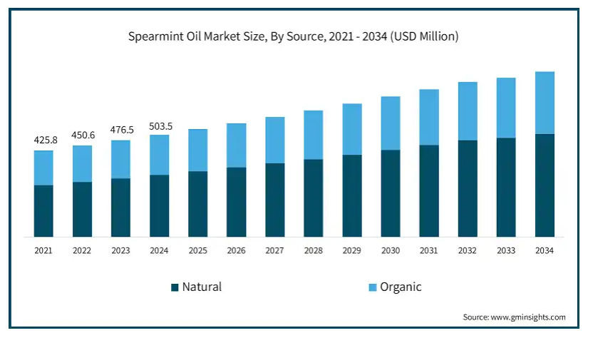 世界のスペアミントオイル市場規模(2025~2034年):供給源別(ナチュラル、オーガニック)、形態別、用途別、流通チャネル別