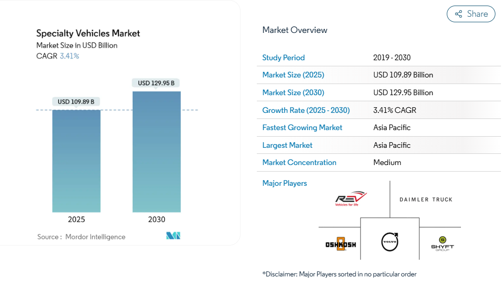 特殊車両市場規模は2025年に1098億9000万米ドルに達し、2030年までに1299億5000万米ドルに達すると予測されており、年平均成長率(CAGR)は3.41%となります。