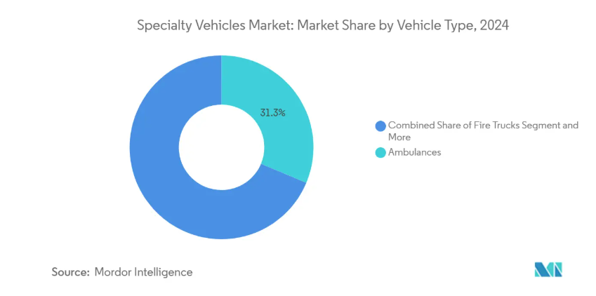 救急車は2024年、特殊車両市場で最大のシェアを占め、義務付けられた更新サイクルと地域救急医療の展開拡大により、収益の31.32%を獲得しました。高齢化社会の進展と迅速な対応時間への規制的焦点から、同サブセグメントは優位性を維持する見込みです。移動診療車は絶対額こそ小さいものの、予防医療の普及や臨時ワクチン接種拠点への医療シフトを反映し、5.36%のCAGRで急成長カテゴリーとなっています。消防車両は公共部門からの安定した受注を継続する一方、災害管理の複雑化に伴い指令センターの需要が高まっています。