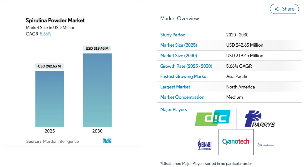 スピルリナ市場は中程度の分散化が特徴であり、生産規模の拡大と規制の明確化が進むにつれ、戦略的な統合の道が開かれています。DIC株式会社、アースライズ・ニュートリショナルズ、サイアノテック・コーポレーションなどの主要企業は、栽培から加工までの品質管理を確保するため、産業統合を重視しています。これらの企業は、菓子向け着色料グレードのスピルリナやサプリメント向け栄養補助食品グレードの品種など、用途特化型のブランディングを採用し、多様な消費者層に対応しています。