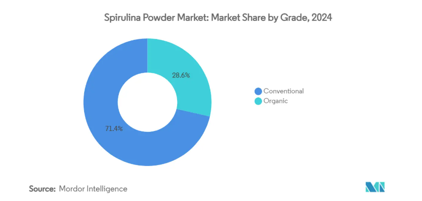 2024年現在、従来型スピルリナはコスト効率の高い生産と強固なグローバルサプライチェーンにより、71.42%という圧倒的な市場シェアを占めています。これらの利点は、大規模なマス市場向け用途に適しています。その手頃な価格により、大量生産型のサプリメントメーカーや外食チェーンにとって主要な選択肢となっています。例えば、ニュートレックス・ハワイやアースライズは、従来型スピルリナを製品ラインの基盤とし、主流の健康志向市場に対応しています。これらの配合製品は、健康意識の高い消費者をターゲットとしたマルチビタミン、錠剤、スムージーなどに採用されています。このセグメントの優位性は、大量供給と柔軟な調達によって支えられており、広範な流通網を持つメーカーにとって最も入手しやすいスピルリナとなっています。
