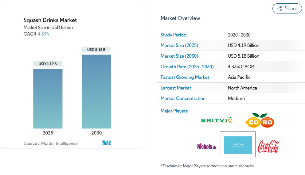 スクワッシュ飲料市場規模は2025年に41億9000万米ドルに達し、2030年までに51億8000万米ドルに達すると予測されており、年平均成長率(CAGR)4.33%で拡大しています。消費者は、特に果汁価格が上昇する中で、コスト意識の高い代替品として、濃縮コーディアル、スクワッシュ、シロップへと移行しています。規制面では、米国食品医薬品局(FDA)による石油由来合成着色料の段階的廃止や、中国食品添加物基準GB 2760-2024の改定などにより、天然着色料や天然甘味料を主成分とする製品への再構成が加速しております。