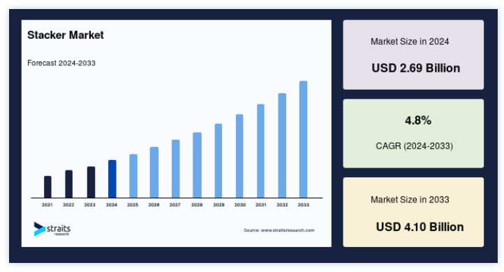 グローバルなスタッカー市場の規模は、2024年には26億9000万米ドルと評価され、2025年には28億2000万米ドル、2033年には41億米ドルに達すると予測されています。予測期間(2025~2033年)のCAGRは4.8%で成長すると見込まれています。
