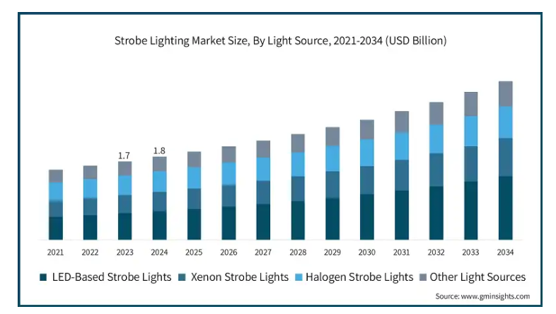 技術革新により、LEDベースのストロボ照明は、長寿命、コスト競争力、エネルギー効率、コンパクトなサイズといった特徴から、高い需要を集めています。これらの照明は極めて明るく、色や周波数を変更できるため、コンサート、緊急車両、産業環境などに最適です。